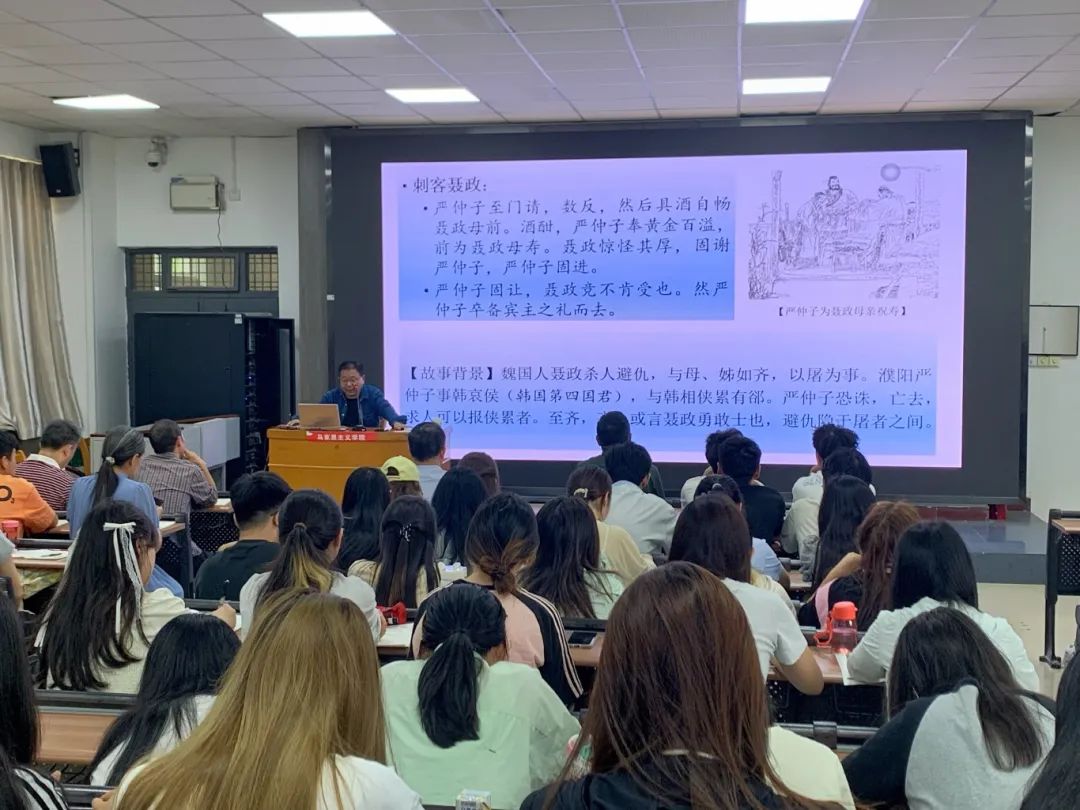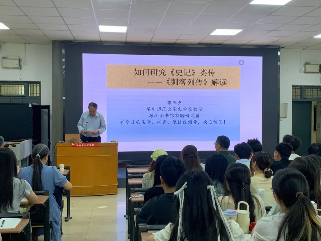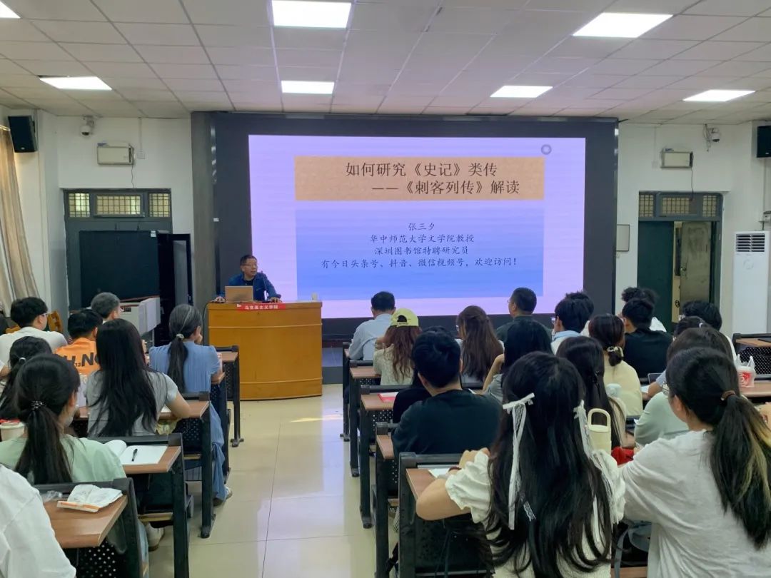 6月6日上午,人文学院特邀著名古典文献学家,教授,博士生导师,中国历史文献学会理事张三夕,在博识楼1101教室为2023级汉语言文学专业近100名学生带来了一场题为“如何研究《史记》类传——《刺客列传》解读”的专题讲座。讲座由我院凌朝栋教授主持。